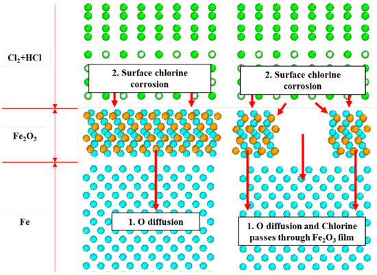 In summary, the corrosion of iron oxide/iron system by chlorine can be divided into two processes (Figure 8): (1) the oxygen diffusion from iron oxide to iron, which changes the structure of the iron oxide; (2) the reaction of chlorine on the surface of iron oxide or the direct reaction with iron through the iron oxide film. Both processes occur nearly simultaneously. However, process 2 lasts longer because the oxide film has far fewer molecules than the gas.