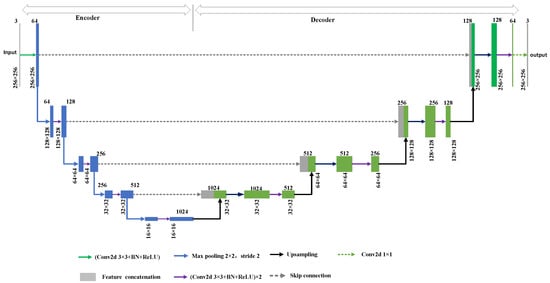 In this section, we briefly introduce the classical U-net network [22]. Its structure is shown in Figure 1. The topology of the U-net is symmetrical, mainly consists of the encoder on the left and the decoder on the right. The encoder is the backbone network to extract abstracting features and information, composed of four basic convolutional units. Each basic convolutional unit consists of a traditional convolutional layer, a batch normalization layer, and a Rectified Linear Unit (ReLU) activation layer, which is then followed by a pooling layer for downsampling. Thus, the encoder uses downsampling to gradually increase the image depth to implement pixel classification, while the decoder uses upsampling to restore the image size and implement pixel positioning.
