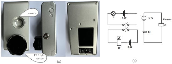 To facilitate the acquisition of fluorescent images, we designed a portable acquisition device that integrated a light source that emits UV light and a digital camera. The appearance of the designed device is shown in Figure 3a. The rated power of the UV light source is 15 W, which can produce approximately 5000 W/cm2 UV light at most. Different light levels with a lithium battery as the supply can be adjusted according to practical situations. In our experiments, the focus of UV light source was fixed, and the rated wavelength was designed for 365 nm UV light. The cooperative operation of the light source and the digital camera was implemented through a control unit, and its corresponding simplified circuit is shown in Figure 3b, where the symbols “S” and “KT” denote the primary switch and time relay, respectively; the symbols “L” and “Camera” denote the UV light source and digital camera, respectively.