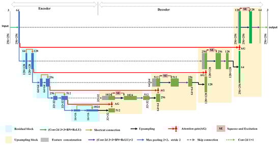 The proposed DAttRes-Unet model is an end-to-end network for leaked oil detection, and its architecture is similar to that of a classical U-net, symmetrically consisting of the encoder and the decoder, as shown in Figure 4. In the encoder, the basic convolutional unit, composed of a convolutional layer, batch normalization, and a ReLu activation layer, are the same as in the classical U-net. A max-pooling layer with a kernel and a stride of 2 was used to select the most powerful features. Different from the classical U-net shown in Figure 1, four residual blocks are embedded in the encoder to overcome the vanishing gradient problem. In the decoder, different from the classical U-net, an AG block is embedded to enhance the richer low- and high-level information by weighting oil pixels. Followed by a feature concatenation layer, an SE block is embedded as the channel attention to yield a higher weight coefficient for more relevant channels. Finally, a Softmax layer is used to obtain the final segmentation results. The details of the residual block and the SE block are described in the following subsection.