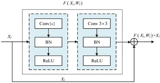 The structure of the residual block is shown in Figure 5 and primarily consists of two convolution units and identity mapping. Each convolution unit is composed of a convolutional layer, batch normalization, and a ReLU activation layer. The identity mapping connects the input and output of the residual block, and the residual operation is denoted as