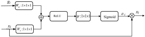 is obtained using additive attention, and its diagram is shown in Figure 6. As the result after upsampling, the attention gating sign vector is used for each pixel to determine focus regions. The additive is formulated as follows: