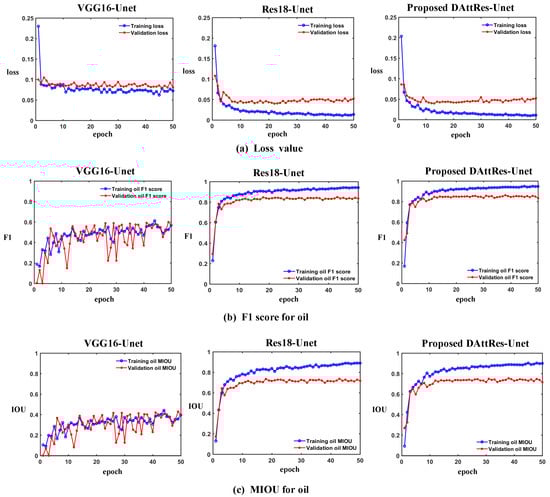 VGG16-Unet and Res18-Unet also use the binary cross entropy in (7) as a loss function and the Adam optimizer with the same , learning rate, and epoch number as the proposed model. The loss values of the three models for the training and validation data are shown in Figure 8a. Because we primarily focused on oil segmentation, and experimental results showed that there is no marked difference in the performance indices for the background (non-oil region) among the comparative models, we only show the “” score and “IOU” values for oil pixels versus the training epoch in Figure 8b,c. Figure 8 shows that the models with ResNet18 as the encoder can achieve lower loss values and higher “” scores and “IOU” values than those with VGG16.