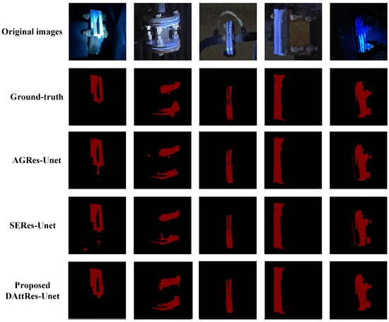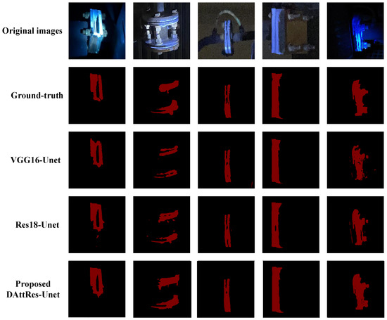 Considering that the proposed DAttRes-Unet model inherits the framework of the classical U-net and uses the pretrained ResNet18 [32] as the encoder, we compared the proposed model with VGG16-Unet and Res18-Unet, commonly used in segmentation, where VGG16-Unet uses the pretrained VGG16 as an encoder due to VGG16 with good performance, while Res18-Unet uses ResNet18 as an encoder without embedding any attention modules in the decoder path. VGG16 and ResNet18 were selected for use in this study because their layer depths are similar or equal to that of the proposed model, providing a fair comparison of their results.