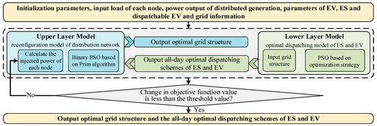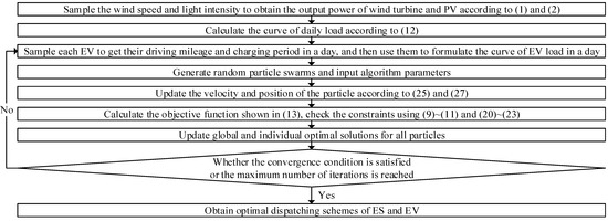 - Solve the lower layer optimization model using the PSO based on optimization strategies and output the optimal charge/discharge dispatching schemes of ES and EV in 24 h.