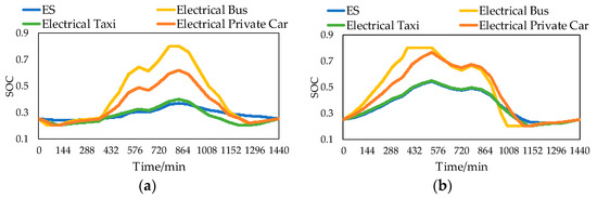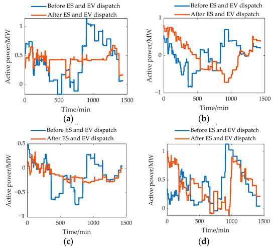 - The optimal dispatching model for ES and EV is proposed to realize the cooperation of ES and EV. Compared with the existing studies that only use optimal dispatching strategies to solve other problems of distribution networks, the proposed model takes ES and EV as indispensable parts of the system, thus fully releasing the adjustable potential of them.
