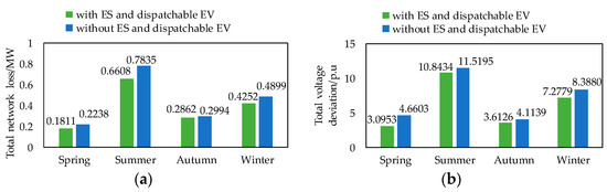 - Taking ES and EV into consideration, the optimal dispatching model can reduce the total network loss and the voltage deviation by 15.66% and 15.52%, respectively. The dead time constraint strategy can reduce the total time that the battery is in the dead zone and the total non-working time of the battery, thus reducing the total cost of the network. The charge/discharge power optimization strategy plays a role in smoothing the load. With these strategies, the optimal dispatching model can achieve optimal operation of the distribution network with ES and EV.