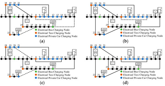 | Accessed nodes | Node 3, 32 (6 electrical bus per node) | Node 8, 18, 22, 25 (6 electrical taxi per node) | Node 9, 10, 11, 12, 13, 14, 19, 20, 21, 24 (12 electrical private car per node) |