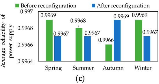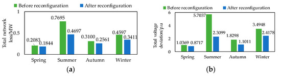 - The DNR model can change the power flow by obtaining the optimal grid structure using the binary PSO and the Prim algorithm. This model can reduce the total network loss and the voltage deviation by 28.39% and 44.46%, respectively. The average reliability of power supply after DNR only decrease by 0.01%. In summary, the DNR has positive effects on total network loss and voltage deviation with little negative impact on the reliability of the power supply. Moreover, the Prim algorithm can make sure the topology of the generated grid structure is radial and the Pareto optimality is extremely effective in dealing with multi-objective optimization problems.