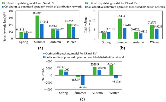 - The two-layer collaborative optimized operation model of the multi-character distribution network, as a combination of the optimal dispatching model of ES and EV and the DNR model, takes all components of the distribution network into consideration and can effectively optimize the grid structure and obtain optimal dispatching scheme. This model can reduce the total network loss and voltage deviation by 26.54% and 27.04%, respectively. The total cost of the system is reduced by 114.45% after the collaborative optimized operation of the distribution network, which makes the system change from paying to gaining.