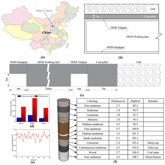 Overview of Xiqu Coal Mine: (a) mine location; (b) layout of working face; (c) section view; (d) roadway deformation; (e) gas concentration; (f) section view.
