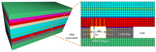With the help of the finite element software FLAC3D 6.0, a numerical calculation model is established according to the field conditions, as shown in Figure 3. The Mohr–Coulomb model is adopted, with the length × width × height = 50 m × 20 m × 25 m, and the section width × height = 4 m × 3 m of the return air roadway in the 18506 working face, with a total of 208,000 units and 219,473 nodes. The horizontal displacement in the lateral direction of the model and vertical displacement on the bottom of the model are limited. The top side of the model is the stress boundary, and a load of 2.6 MPa is applied to simulate the weight of overlying strata, with a lateral pressure coefficient of 1.2. To study the stability characteristics of the coal pillar in roadway protection under different widths, the width of the coal pillar in roadway protection is taken as 7 m, 9 m, 11 m, 13 m, and 15 m respectively. See Table 1 for the lithologic parameters used in the numerical model.