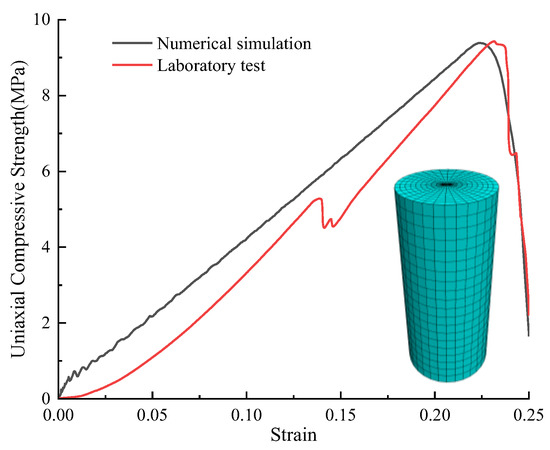 In order to ensure the accuracy of the coal seam mechanical parameters in the numerical calculation model, FLAC3D was used to establish a correction model with diameter × height = 5 m × 10 m, and the coal pillar was subjected to the uniaxial compression test, which was compared with the results of the laboratory uniaxial compression test [37,38]. The correction results are shown in Figure 4.