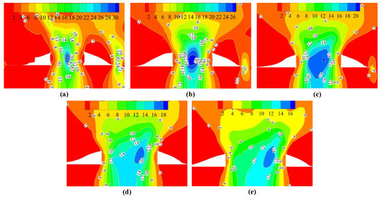 The nephogram of the vertical stress distribution of the surrounding rock with different top cutting angles is shown in Figure 13. It can be seen from Figure 13: ① With the increase in the roof cutting angle, the length of the hanging roof also increases, which leads to the aggravation of the stress concentration in the coal pillar. ② Although the top cutting angles are different, they all change the position of the roof fracture line to some extent, and the top cutting angle of the vertical roadway roof is the best.