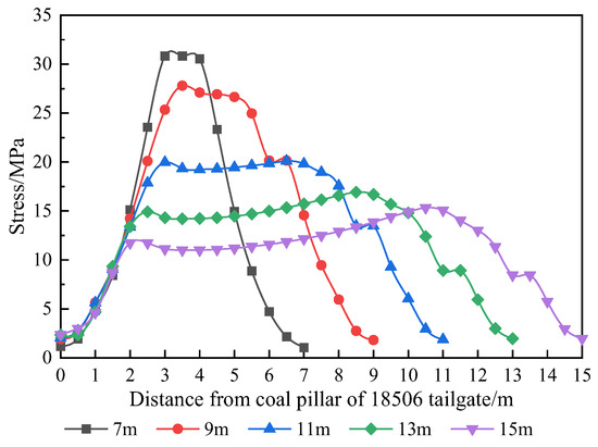 Vertical stress distribution curve of coal pillars with different widths during mining.
