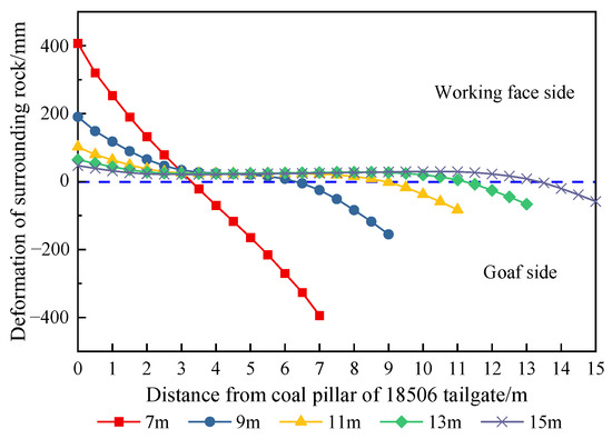 The internal deformation of coal pillars with different widths during mining is shown in Figure 7. It can be seen from Figure 7: ① With the increase in coal pillar width, the deformation of the coal pillar in the roadway protection gradually decreases. ② The width of the coal pillar in the roadway protection has a great influence on the internal deformation of the coal pillar; there is an inflection point at 11 m, the deformation before the inflection point is larger, and the deformation after the inflection point tends to be gentle. ③ When the width of the coal pillar is 7 m, the maximum deformation of the coal pillar at the working face side is 406 mm, and that at the goaf side is 393 mm. When the width of the coal pillar is 9 m, the maximum deformation on both sides of the coal pillar is 190 mm and 155 mm. When the width of the coal pillar reaches 11 m or more, the deformation on both sides of the coal pillar is greatly reduced, and all are less than 100 mm.