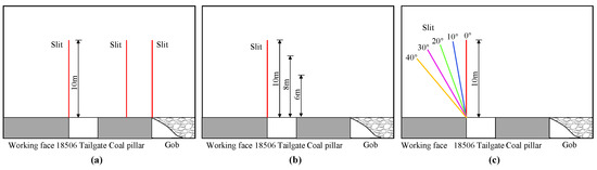 Roof cutting and pressure relief can change the roof structure of the hard overburden, which is an effective measure to reduce the overlying load of the roadway. However, at present, there are different views on the location of roof cutting, mainly focusing on the side of the working face, above the coal pillar and the goaf. Cutting the roof on the side of the working face can change the fracture line of the overlying strata, make the overlying strata collapse vertically after the mining of the working face, and better fill the goaf. Cutting the roof above the coal pillar can reduce the energy accumulation inside the coal pillar. Goaf side roof cutting can effectively cut off the gob side roof, reduce the length of the hanging roof, and reduce the effect on the coal pillar [39,40,41,42,43]. However, for different geological conditions, different roadway layouts, different coal pillar widths, and other issues, specific problems should be analyzed, the best hydraulic fracturing topping position should be determined, and reasonable topping parameters should be selected so that the internal stress environment of the coal pillar can be optimized. In view of this, the characteristics of coal pillar isolation stability under different top cutting positions, heights, and angles are studied, respectively, and the schematic diagram of the simulation scheme is shown in Figure 8.