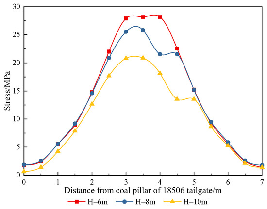 The vertical stress curves of the surrounding rocks with different top cutting heights are shown in Figure 12. It can be seen from Figure 12: ① When the top cutting height is 6 m, the peak stress in the coal pillar is 28.2 MPa, which is only 8.4% lower than that without top cutting. ② When the top cutting height is 8 m, the peak stress in the coal pillar is 25.8 MPa, which is 16.2% lower than that without top cutting. ③ When the height of roof cutting increases to 10 m, the peak stress in the coal pillar is only 20.8 MPa, which is 32.5% lower than that without roof cutting.