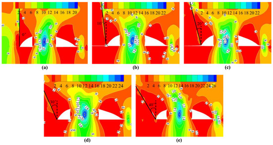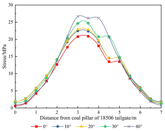In order to compare the influence of different cutting angles on the stress distribution of the surrounding rock, this simulation selects five cutting angles, which are 0°, 10°, 20°, 30°, and 40°. The length of the cutting seam is 10 m, and the cutting position is on the working face side.