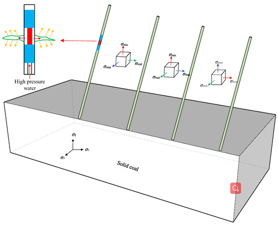 Hydraulic fracturing is a technology that takes high-pressure water as the power, cracks as the carrier, and stress field environment as the leading factor, in which the stress field environment is difficult to control. After the excavation of the roadway, the initial stress state of the rock mass is changed, and the direction and magnitude of the maximum and minimum principal stresses are changed to varying degrees. At the same time, the stress field of the surrounding rock of the roadway is more complicated due to the influence of mining stress and other factors. When the roof stress environment is constantly changing, the hydraulic fracturing of each borehole will also show different effects, so it is necessary to study the hydraulic fracturing mechanism under different stress fields. The stress field distribution of the roof is shown in Figure 15.