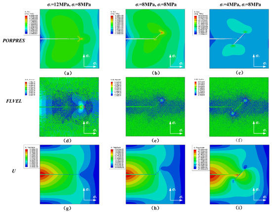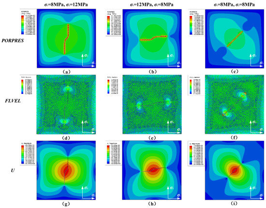Fracture propagation effect of hydraulic fracturing in different stress fields. (a) PORPRES, σ1 = 8 MPa, σ2 = 12 MPa; (b) PORPRES, σ1 = 12 MPa, σ2 = 8 MPa; (c) PORPRES, σ1 = 8 MPa, σ2 = 8 MPa; (d) FLVEL, σ1 = 8 MPa, σ2 = 12 MPa; (e) FLVEL, σ1 = 12 MPa, σ2 = 8 MPa; (f) FLVEL, σ1 = 8 MPa, σ2 = 8 MPa; (g) U, σ1 = 8 MPa, σ2 = 12 MPa; (h) U, σ1 = 12 MPa, σ2 = 8 MPa; (i) U, σ1 = 8 MPa, σ2 = 8 MPa.