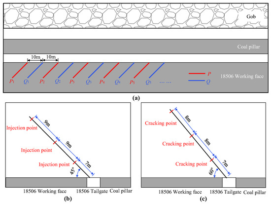 Layout of hydraulic fracturing boreholes in the 18506 working face: (a) layout of the drillings; (b) type P borehole; (c) type Q borehole.