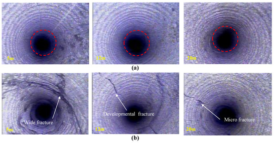 In order to test the effect of hydraulic fracturing, the distribution of cracks in the rock mass before and after fracturing is observed using a borehole peeper, and the observation results are shown in Figure 20. Before cracking, there are a few tiny cracks in the shallow rock mass, no visible cracks in the deep rock mass, and high integrity of the roof strata. After cracking, the cracks in the hole wall developed clearly, the shallow cracks appeared with wide width, the middle and deep cracks developed noticeably, and the number of cracks increased significantly.