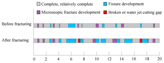 Next, the fracture development of the rock mass before and after hydraulic fracturing are compared, and a sketch map of fracture development in drawn, as shown in Figure 21. Moreover, by examining the sketch map of fracture development, it is found that after hydraulic fracturing, the rock mass in the borehole forms an obvious fracture development zone under the influence of high-pressure water. This shows that hydraulic fracturing can effectively reduce the integrity of the hard roof and improve the stress distribution of the roof.