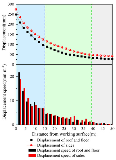 After hydraulic fracturing, the deformation of the roof and floor of the roadway and the surrounding rocks of the two sides behind the working face are monitored, and the displacement changes and displacement change rates of the roof and floor and the two sides are counted. The monitoring results are shown in Figure 22. When the observation point is more than 40 m away from the working face, the surrounding rock is relatively stable. When it is 50 m away from the working face, the deformation of the roof and floor is only 27.5 mm, and that of the two sides is only 42.1 mm. Within the range of 15~40 m from the working face, the movement trend of surrounding rock begins to strengthen, and the deformation rate of roof and floor and two sides is basically stable at about 5 mm/m. Within 15 m away from the working face, the surrounding rock moves violently, and when the roadway is flush with the working face, the deformation of the surrounding rock is the largest, with the roof and floor reaching 249.1 mm and the deformation of the two sides reaching 274.7 mm This indicates that after hydraulic fracturing, the stress distribution of the surrounding roof rock is improved, the deformation of the surrounding rock is controlled, the internal stress of the coal pillar is released, and the coal pillar will not be significantly destroyed, which can ensure the safety of the mining face.