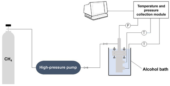 To assess the stability of methane hydrate in biomaterials, phase equilibrium diagrams of pure methane hydrate and methane hydrate in biomaterials were measured. All methane hydrate samples were synthesized at an initial pressure of ~8 MPa and a circulating temperature of −5~5 °C in the high-pressure reactor. It was considered that hydrate synthesis was completed when no further pressure drop was observed. After hydrate synthesis, the pressure in the reactor was decreased (~0.1 MPa) at constant temperature and then stabilized for 2 h to observe whether the pressure increased significantly. If there was no significant increase, further pressure reduction (~0.1 MPa at a time) was required until a significant pressure increase occurred. The pressure value at this time was below the equilibrium pressure required at the temperature point, and the hydrate would continue to decompose until the pressure barely changed (ΔP < 0.02 MPa) over ~8 h, indicating that a new equilibrium was reached. The equilibrium pressure value was recorded and the corresponding equilibrium point could be obtained. Subsequently, the temperature was decreased and the previous steps were repeated to obtain a series of equilibrium points. The equipment used here is the same as that used in gas adsorption and desorption measurements, as shown in Figure 1.
