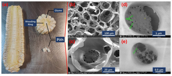(a) Macrostructure of corn cob; (b) Microscopic bundle structure of the corncob pith sample; (c) Dark oval−like areas on the walls of bundles; (d,e) Nanopores in the dark oval-like areas.