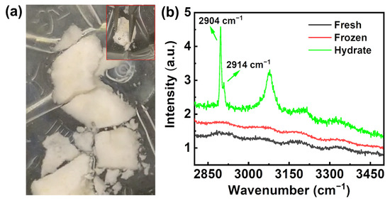 Bubbles seen on the surface of the corncob pith could be methane gas produced by the decomposition of hydrates formed in the corncob pith. To verify this, Raman experiments were conducted on the samples after the methane adsorption experiment, and the results are shown in Figure 4b. The fresh and frozen corncob pith had no distinct Raman peaks, while two identified Raman peaks of hydrate characteristics appeared in the hydrates synthesized in corncob pith, which indicates the formation of methane hydrates. The two peaks with an area ratio of 3 appear at 2904 cm−1 and 2914 cm−1, indicate that structure-I (sI) [25] hydrate was formed in the corncob pith. Therefore, the methane stored in corncob pith was in the sI hydrate form.