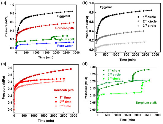 After the storage form of methane gas in biomaterials was confirmed, methane uptake kinetics at 273.15 K in samples of waxy corncob pith, sorghum stalk, and eggplants were further investigated and compared with the kinetics for bulk, unstirred water. The results are shown in Figure 5a. It can be seen that the methane adsorption kinetics of these samples were much faster than that of bulk water, which adsorbed less quantities of gas at the same time under the same conditions. This indicates that gas adsorption in biomaterials is faster. Among these three biomaterials, the pressure drop of eggplant was highest after methane gas adsorption for 600 min, followed by the corncob pith; sorghum stalk has the lowest pressure drop. However, the highest pressure drop of eggplant only appeared in the first methane adsorption cycle. In the second and third methane adsorption cycles, as shown in Figure 5b, the methane adsorption capacity of eggplants significantly dropped, while the methane adsorption capacities of corncob pith and sorghum stalk changed little (Figure 5c,d). This indicates that although eggplant has the best ability to adsorb methane for the first time, its reusability is poor.