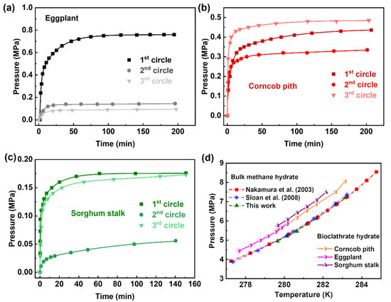 (a–c) Curves of methane gas release from eggplant, corncob pith, and sorghum stalk; (d) equilibrium curves of methane hydrate in eggplant, corncob pith, and sorghum stalk.