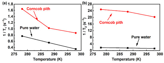 First, the spin-lattice relaxation rates (1H-1/T1) and 1H spin-spin relaxation rates (1H-1/T2) of pure water and fresh corncob pith were measured at different temperatures (278 K, 288 K, and 298 K). As can be seen from Figure 7a, the 1/T1 values for water molecules in corncob pith always relaxed faster than molecules in the bulk liquid under experimental conditions. The 1/T1 for water molecules in corncob pith were 1.8 s−1 (278 K), 1.6 s−1 (288 K), and 1.2 s−1 (298 K), respectively, while the 1/T1 for bulk water molecules were 0.77 s−1 (278 K), 0.56 s−1 (288 K), and 0.35 s−1 (298 K), respectively. Regardless of temperatures, 1/T1 for confined water molecules in corncob pith was larger than bulk water, which is consistent with previous work [38,39]. This phenomenon indicates the molecular motion of water was inhibited in biomaterials compared to that of bulk water.