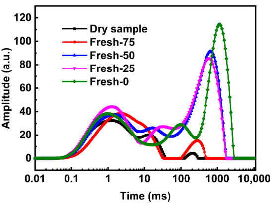 Relaxation time distributions for corncob pith in different conditions: (fresh-0) “as it was”; (fresh-25) after being dried at 40 °C for 25 min; (fresh-50) after being dried at 40 °C for 50 min; (fresh-75) after being dried at 40 °C for 75 min; (dry) after vacuum drying.