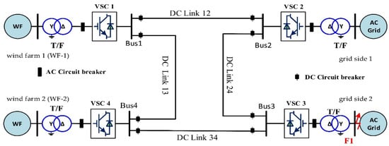 A four-terminal, VSC-based MTDC test grid is presented in Figure 1. Transmission lines are linked through positive and negative DC-link voltage. The DC inductor (100 mH) is connected at each end of the transmission line to exhibit a practical DC scheme. Each transmission line is 100 km long, and the DC test grid rating is presented in Table 1.