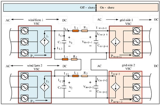 Nodes and branches are connected to obtain an equivalent model. A four-terminal MTDC grid with two off-shore wind farms and two on-shore grids is presented in Figure 3.