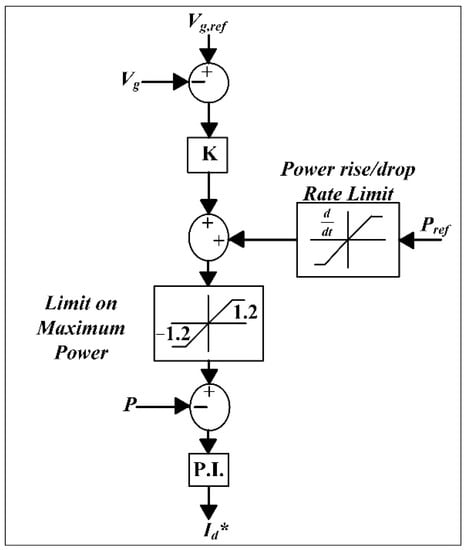 The d–q axis currents regulate the reactive and active power using Equations (25) and (26). The AC voltage controller injects the proper amount of reactive power to control the AC voltage magnitude at the PCC, such that it resembles the given reference voltage. Likewise, the q-axis current regulates the AC voltage. The DC-link voltage is maintained at a predetermined reference value by exchanging an appropriate active power with the AC system. Thus, the d-channel current regulates the DC-link Voltage.
