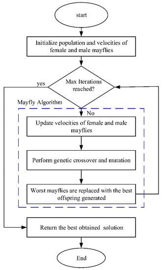 Therefore, a new optimization technique called the MA has been developed in recent years, which has presented better convergence performance [29]. Tsafarakis and Zervoudakis proposed this algorithm, and it is the latest technique used to resolve the non-linear optimization problem [30]. MA is a hybrid approach containing the benefits of evolutionary and swarms’ intelligent algorithms, such as GA [22], PSO [26], and firefly algorithms (FA). PSO requires modification to escape from a local optimum for large dimension problems [29,31]. Inspired by the flight behavior and mayflies’ mating procedure, the proposed technique offers a practical yet straightforward solution and swarm intelligence [30]. The necessary amendments are performed in MA to improve the algorithm performance across large- and small-scale dimensions. Hence, it was found suitable for a complex framework.