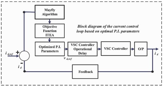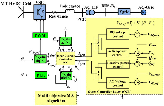 The vector current control (VCC) method is applied to control the VSC-HVDC station. It contains two control loops: an outer control layer (OCL) and inner current control (ICC) layer [14]. Based on the associated AC grid’s demands, the outer layer attains its target by regulating the reactive or active power, AC or DC voltage control, to VSCs. At the same time, ICC controls the q- and d-axis currents via a decoupled control. Both layers have a common significant element: an integral and proportional controller. The outer control layer regulates the power-sharing within the DC grid via voltage droop control and DC-link voltage in a precise range [7]. After analyzing the interrelating control layers of the MTDC network, the VSC-terminal was revealed as a complex multi-output and multi-input control system [15]; this complex architecture has various variables that demand robust and simple control [16]. Therefore, the associated P.I. parameters should be optimally adjusted and tuned, enhancing the transient and steady-state performance. However, tuning the P.I. controllers’ gains for the non-linear system is challenging [17]. Classical tuning algorithms encounter complications in determining the optimized P.I. parameters [18]. Traditional algorithms tune the P.I. parameters using approximate linear models, while the VSCs are non-linear and do not deliver good results [19,20].