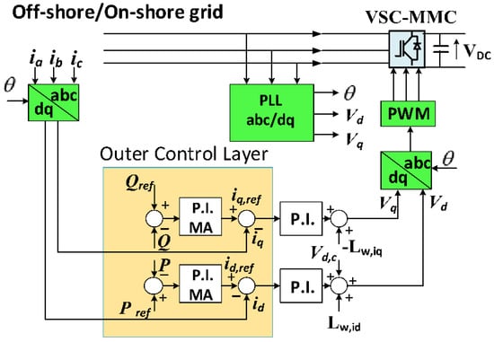 Considering the inclusive dq frame, the outer controller controls the AC and DC voltage, reactive and active powers at the point of common coupling (PCC). The q-channel controls the AC voltage or reactive power, whereas the d-channel controls the DC voltage or active power, as presented in Figure 6 and expressed as: