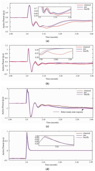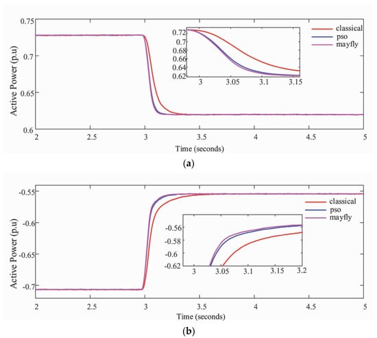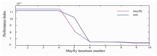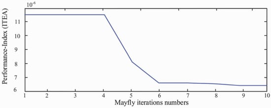 Likewise, the aim was to minimize the objective function defined in Equation (42). The fitness function values using PSO optimization are shown in Figure 16, and the obtained controller parameters are given in Table 6. It is essential to highlight that, in earlier iterations, the PSO’s performance index is better than a Mayfly. However, the Mayfly algorithm’s convergence rate and speed for the later iterations improve the performance more than the PSO. Further, the active power profile obtained by Mayfly, PSO, and classical tunning is shown in Figure 17. The results exhibit significant improvements and a faster rising time for Mayfly than the PSO and classical tuning.