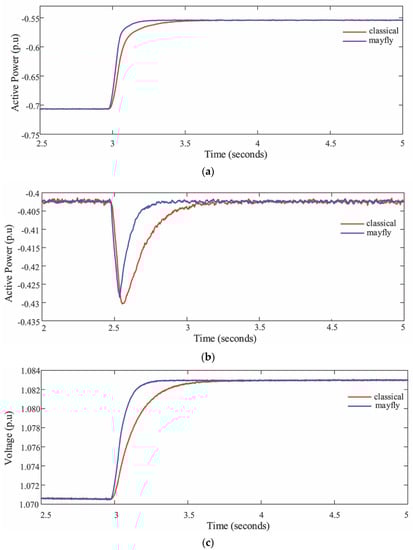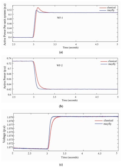 In this scenario, the stability margin of the proposed and conventional control parameters is observed under the time domain. There are some constraints to follow when finding gains for the controllers [25]. Usually, the hit and trial model is utilized to find the conventional gains while considering the constraints as limits [25]. With this in mind, and following the computation in Section 7, the time response is based on MA and classical tuned control parameters tested for the ramping of wind-farm power. At first, wind farm 1 power increases from 0.4 p.u to 0.51 p.u, while wind farm 2 remains constant. This sudden change caused a rise in DC-link voltage from 1.071 p.u to 1.079 p.u. Second, the power of wind farm 2 decreases from 0.725 p.u to 0.625 p.u, respectively. From Figure 14, the Mayfly parameters clearly show significant improvements compared to the classically tuned parameters. Comparatively, the stability margin along a rising time is much better than in conventional settings.