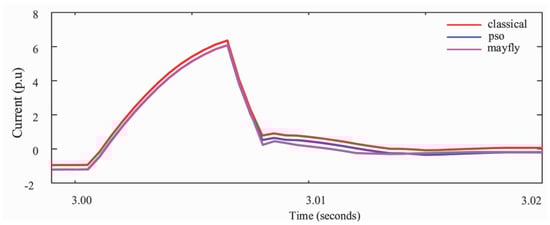The fault current is also less severe in the Mayfly controllers at the gird side 2, as shown in Figure 19. Moreover, this phenomenon puts less strain on the HVDC grid components. In HVDC, protection is an important issue that needs consideration. Suppose this optimal technique is placed with robust fault detection and the hybrid circuit breaker. The time response would be better, but the stability margin would also improve.