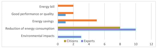The public seems to find the idea of EE quite complex: they associate it with several concepts. As can be seen in Figure 2, experts (asked about consumers) and the public both relate EE to a reduction in energy consumption, to potential energy savings in monetary terms and to the performance of appliances in general. Energy bills were mentioned only by the public, and environmental impacts were mentioned only by experts.