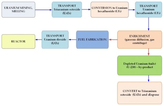 The exact processes of nuclear fuel or spent fuel differ depending on the nuclear fuel cycle technologies utilized. Currently, single and dual fuel cycles are the primary strategies: the once-through cycle (direct disposal or open cycle) and the twice-through cycle (recycling or partially closed cycle). Based on this, nuclear fuel production cycles for both technologies include natural uranium extraction (uranium mining and milling), conversion, and enrichment; the nuclear fuel fabrication cycle for both technologies include natural uranium mining (uranium mining and milling), conversion, enrichment, and fuel fabrication. Figure 1 shows the mass flows during nuclear fuel production.