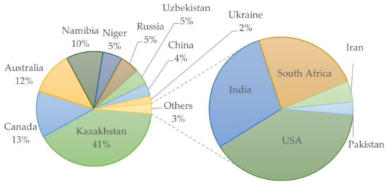 Distribution of worldwide uranium production in 2018 [].