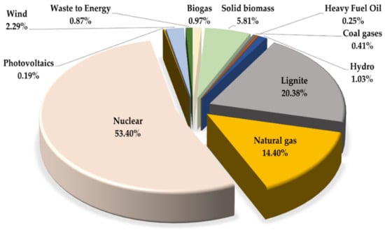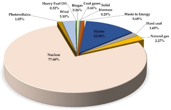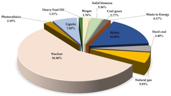 Figure 3, Figure 4, Figure 5 and Figure 6 illustrate (using pie charts) the electricity grid mix for countries with >50% nuclear energy use (France, Slovakia, Ukraine, and Hungary) in 2021. Electricity mixes were modeled according to country-specific situations. Here, the electricity from nuclear energy is a mix of pressurized water (PWR) and boiling water (BWR) reactors. The pie charts represent an average country-specific electricity supply, which included electricity consumption, transmission/distribution losses, and electricity imports. Individual renewable energy sources were calculated according to the current national electricity grid mix. The electricity provided by non-combustible renewable energy sources is also considered national or regional situations, such as solar radiation (photovoltaic), annual full load hours (wind power), and share of hydropower stations. The data of these electricity mixes can be used for life cycle assessment studies, energy models, and combination/optimization of technological processes.