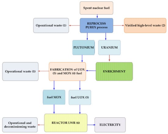 Reprocessing with reuse transforms SNF into high-level vitrified waste, MOX fuel with appropriate fissile content for reuse, and other RW. The extracted plutonium can produce MOX for use in the light water reactor (LWR). Reprocessed uranium is either mixed with plutonium (in a MOX fuel fabrication) or enriched to produce new uranium fuel []. Figure 7 presents the reprocessing with reuse of uranium and plutonium.